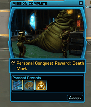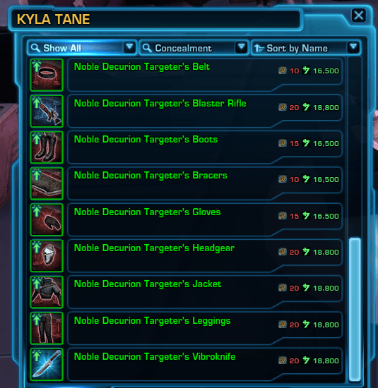 You lot tin then take these Medals of Citation to the Conquest Gear Vendor in the Supplies section of the Republic or Imperial and buy some gear. On the test server, each piece of gear on the vendor costs almost x to 20 Medals of Commendation and each piece is leap to legacy, so you tin can share it betwixt your characters. This type of starting conquest gear is chosen Noble Decurion gear. Your first set of Noble Decurion gear costs a total of 200 Medals of Commendations, which is exactly how much you go from completing conquest, plus about 250,000 credits.